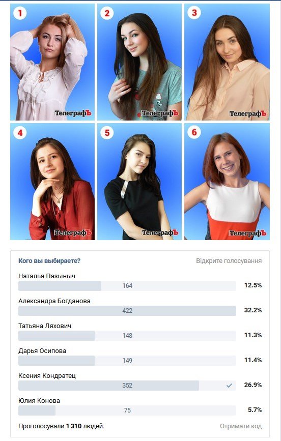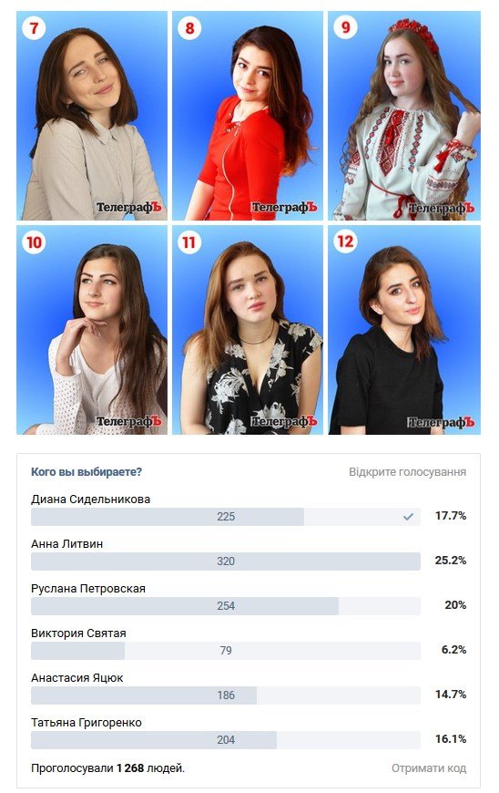 Кременчужане выбрали 6 претенденток на звание «Королевы КрНу по версии читателей «Телеграфа». Первый этап голосования проходил c 17 по 20 мая на нашей странице в Vk.