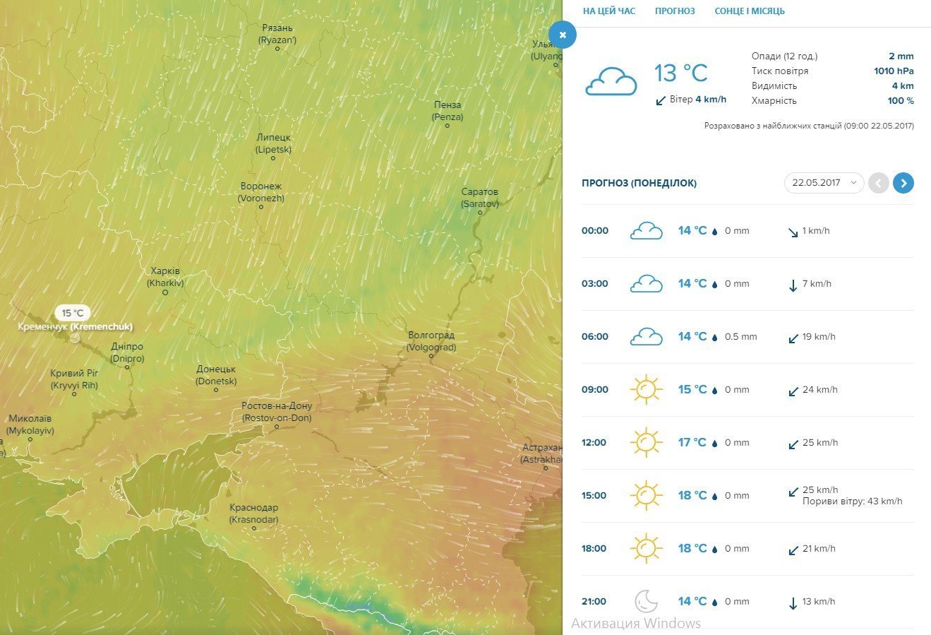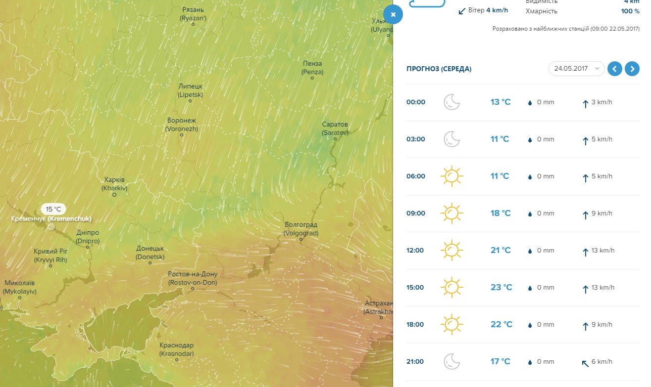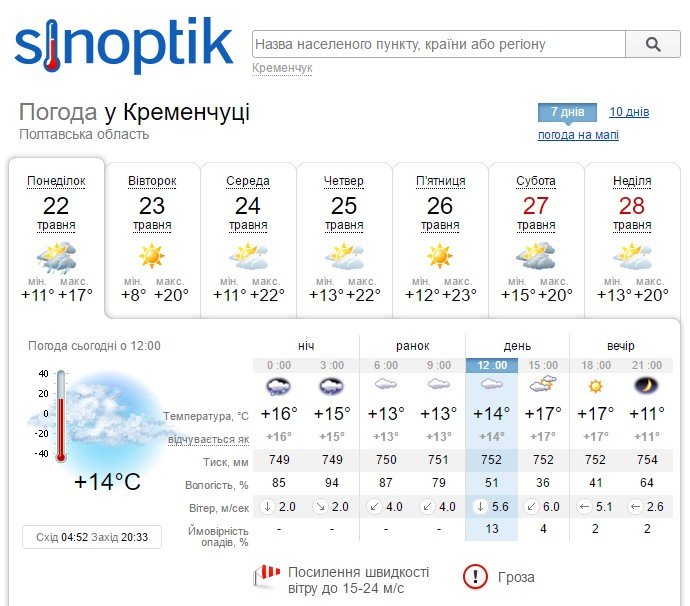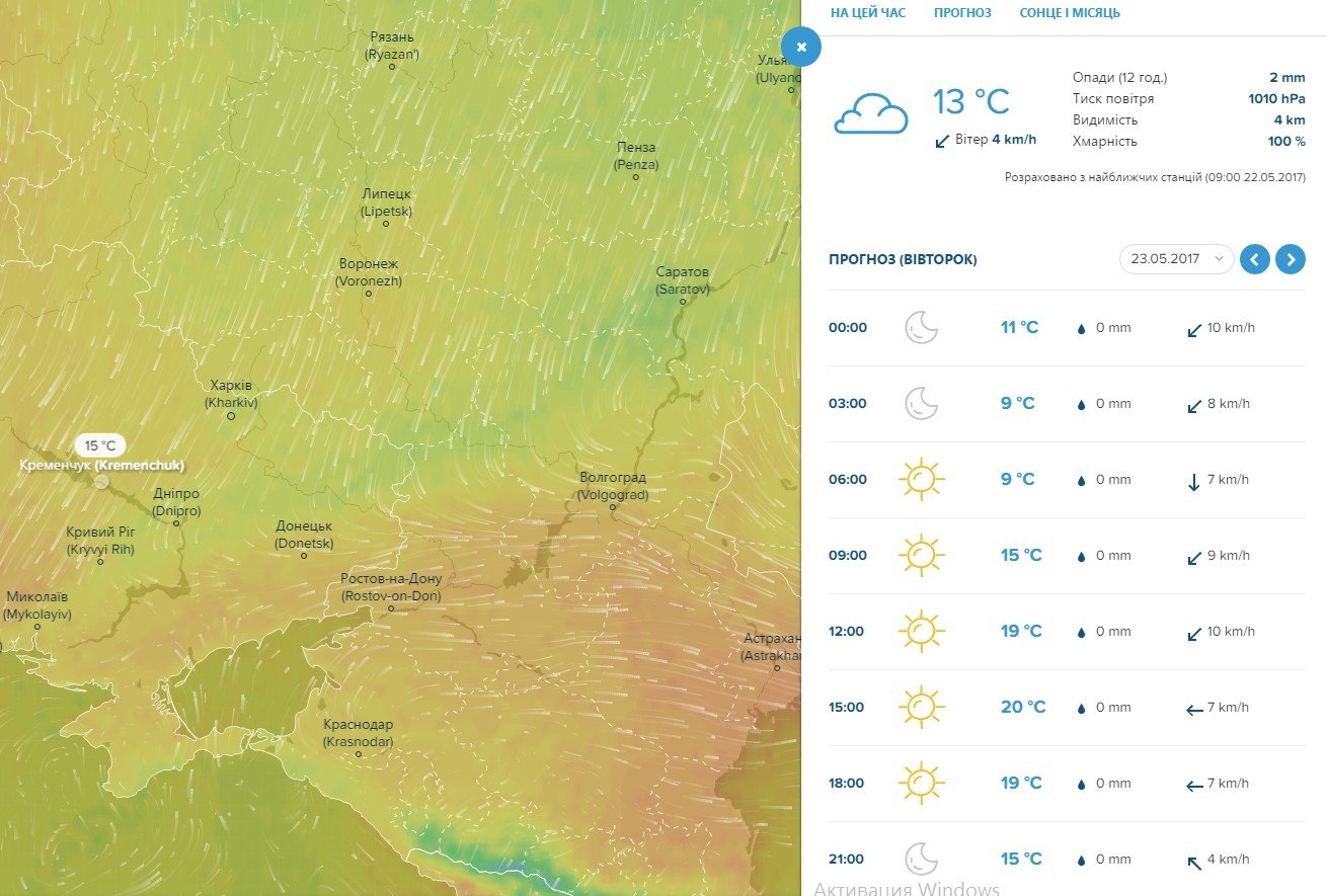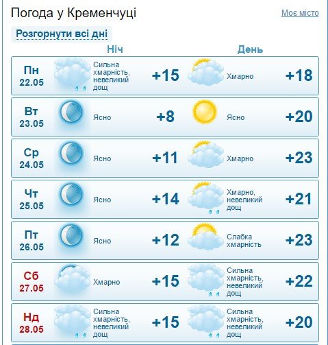 Rp5 також обіцяє нам сьогодні, 22 травня, пориви вітру до 14 м/с. Безхмарного неба, за їх прогнозом, ми на цьому тижні не побачимо. Максимально повітря прогріється до +21ºС у середу, 24 травня. У вихідні, 27-28 травня, можлива злива.