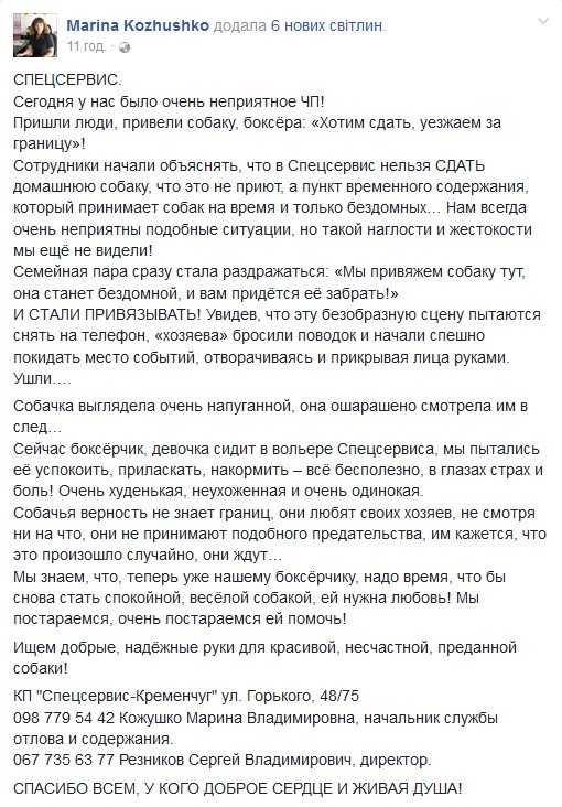 Теперь боксёру ищут новых, любящих хозяев. А работники «Спецсервиса» просят напомнить кременчужанам о том, что бросать животных недопустимо и приводить домашних питомцев к ним, как в приют нельзя.