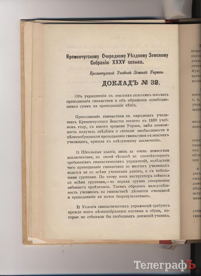 Викладання гімнастики в народних училищах Кременчуцького Земства було запроваджено в 1890-1891 навчальному році. Управа мала можливість отримувати свідчення про ступінь необхідності та доцільності викладання гімнастики у земських училищах і дійшла до невтішних висновків.