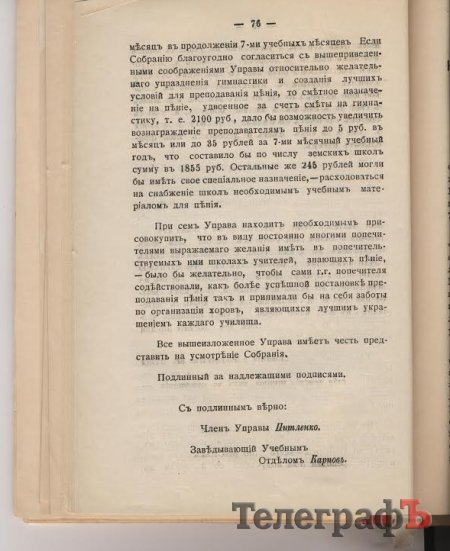 Земська управа переконувала, що досконале вивчення в школах церковних мотивів сприятиме покращенню сільських церковних хорових колективів, а засвоєний в училищі запас світських пісень із доброякісним та доступним для дитячого розуміння змістом здійснить найбільш сприятливий виховний вплив на сільське юнацтво. Самі молоді люди за освітнім задумом, повинні були вносити ці пісні в домашній побут. Саме це повинно відволікати юнаків та дівчат «от водворившегося в малороссийских селах и деревнях типа фривольных песен» (фривольний – легковажний, не зовсім пристойний).