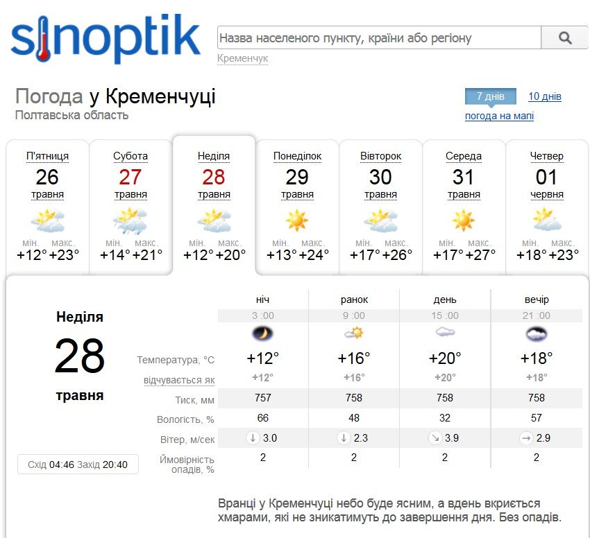 У неділю, 28 травня, вранці у Кременчуці небо буде ясним, а вдень вкриється хмарами, які не зникатимуть до завершення дня. Без опадів. Термометри не здолають позначку у +20ºС.