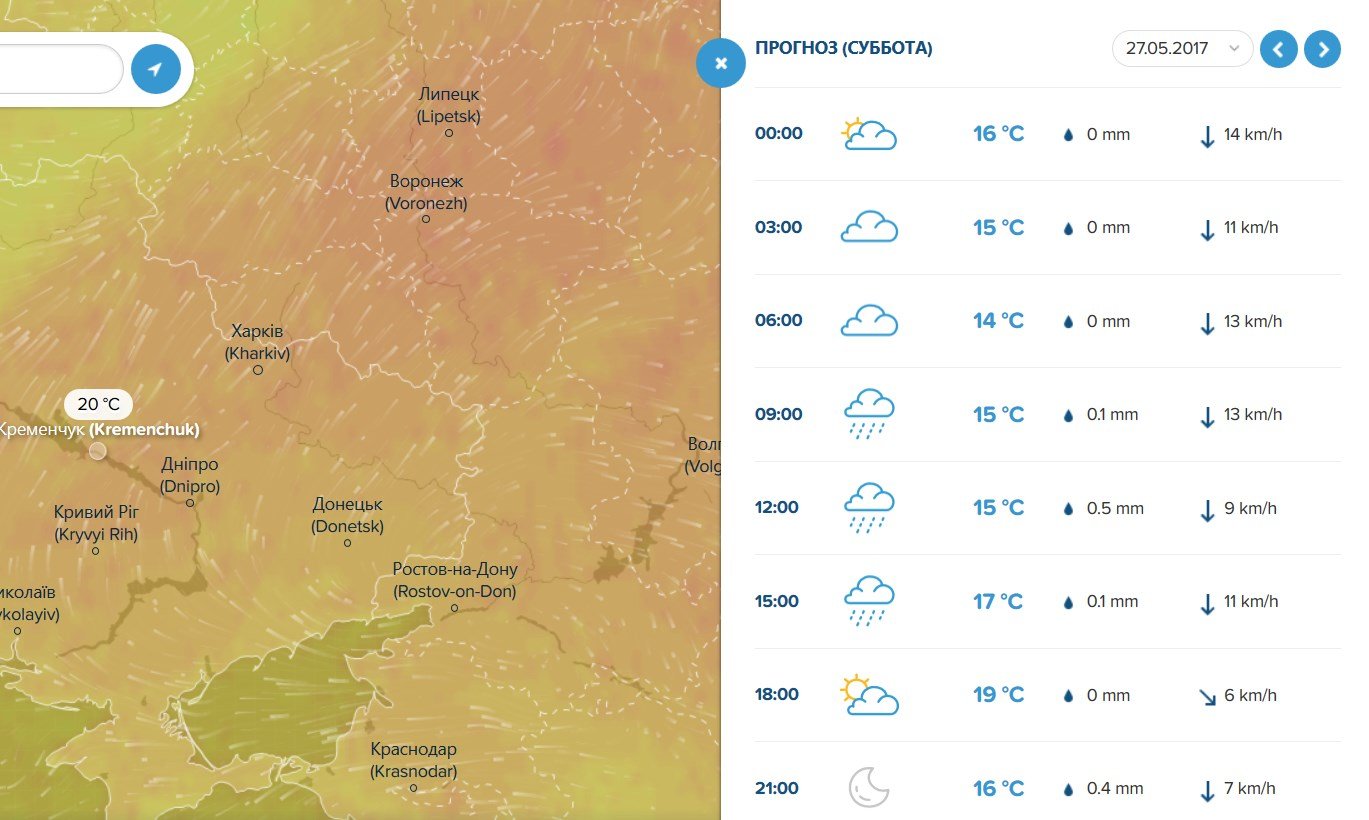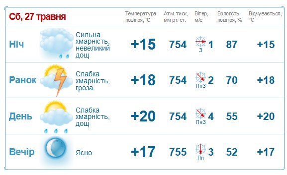 На rp5 нам теж прогнозують зливу у суботу, 27 травня, яка триватиме зранку до ночі. Максимально повітря прогріється до +18ºС. У неділю, 28 травня, розпогодиться. Небо буде хмарними, але невеликий дощ можливий лише ввечері. Вдень здійметься вітер з поривами до 12м/с. Стовпчики термометрів сягнуть +20ºС.