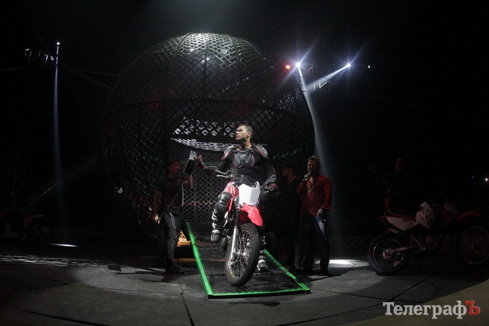 «Шар мужества». Сначала в эту конструкцию заехали 2 мотоциклиста и покрутились на бешенной скорости вокруг ведущего. Потом к ним присоединился еще один. В итоге трюк исполняли шесть мотоциклистов. Все они слаженно ездили по стенам шара, напоминая пчелиный улей.