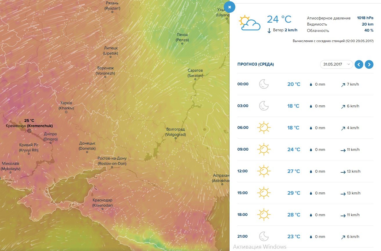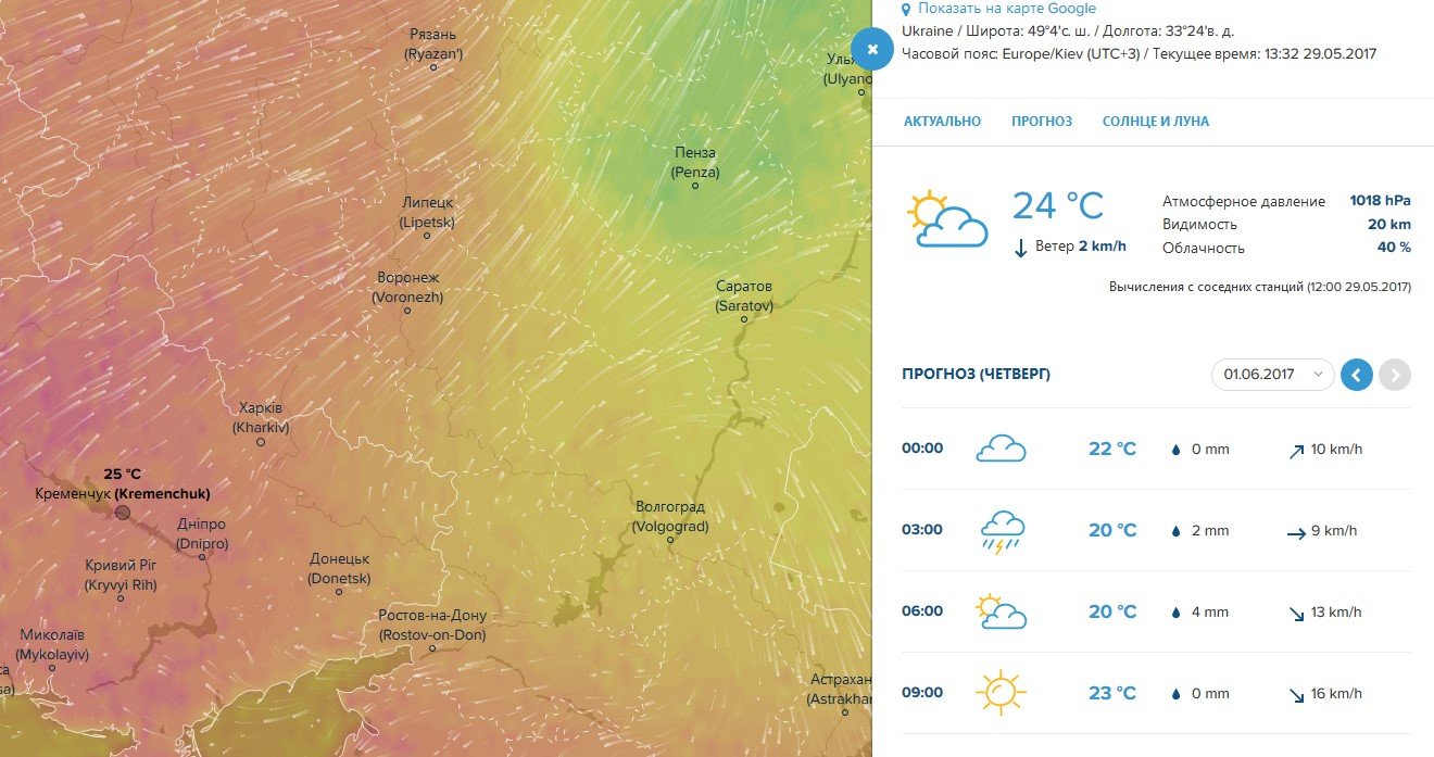 Ventusky прогнозує нам грозу в ніч на четвер, 1 червня. До того небо буде ясним, погода - сонячною, без опадів. Повітря прогріється до +29ºС.