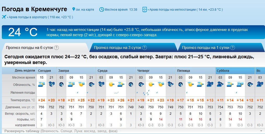 Rp5 обіцяє Кременчуку зливу уже завтра, 30 травня, та у четвер, 1 червня. Невеликі дощі можливі у середу, 31 травня, п'ятницю, 2 червня, та суботу, 3 червня. Вітер з поривами до 16 м/с здійметься у четвер, 1 червня, та не вщухатиме до неділі, 4 червня. Стовпчики термометрів дістануться позначки у +26ºС.