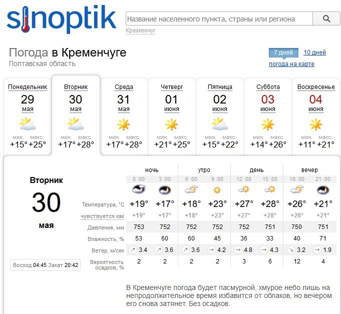 Sinoptik опадів кременчужанам взагалі не прогнозує. Погода, за їх прогнозом, буде сухою та сонячною. Лише у вівторок, 30 травня, та п'ятницю, 2 червня, небо вкриють хмари. Температура повітря коливатиметься від +11ºС до +28ºС.