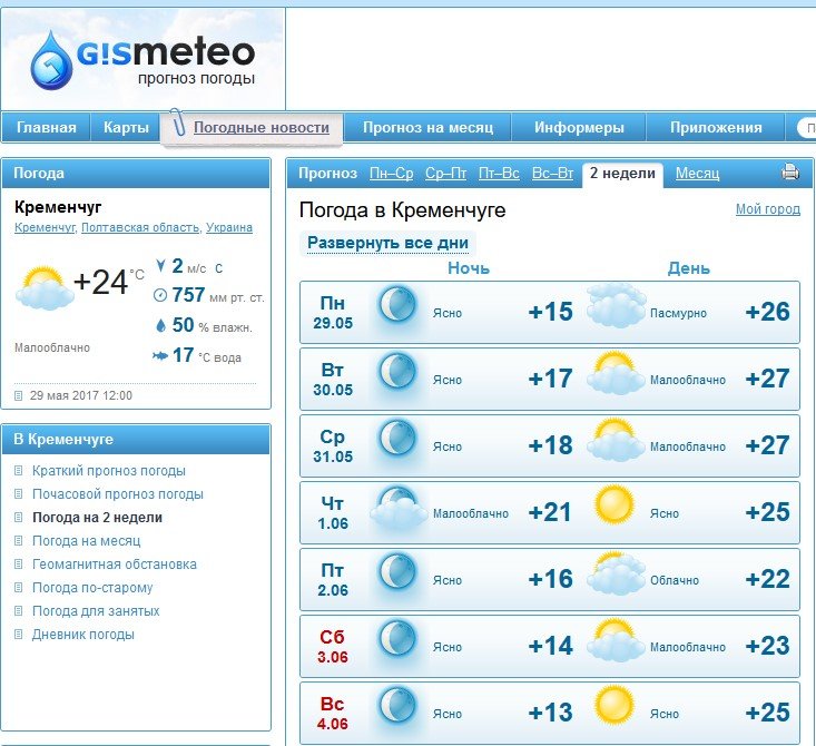 Gismeteo також не обіцяє дощів. За їх прогнозом, тиждень буде спекотним, сухим та сонячним. Сонце, періодично, ховатиметься за хмарами. Ясним небо буде лише у четвер, 1 чевня, та неділю, 4 червня. Повітря прогріється до +27ºС.