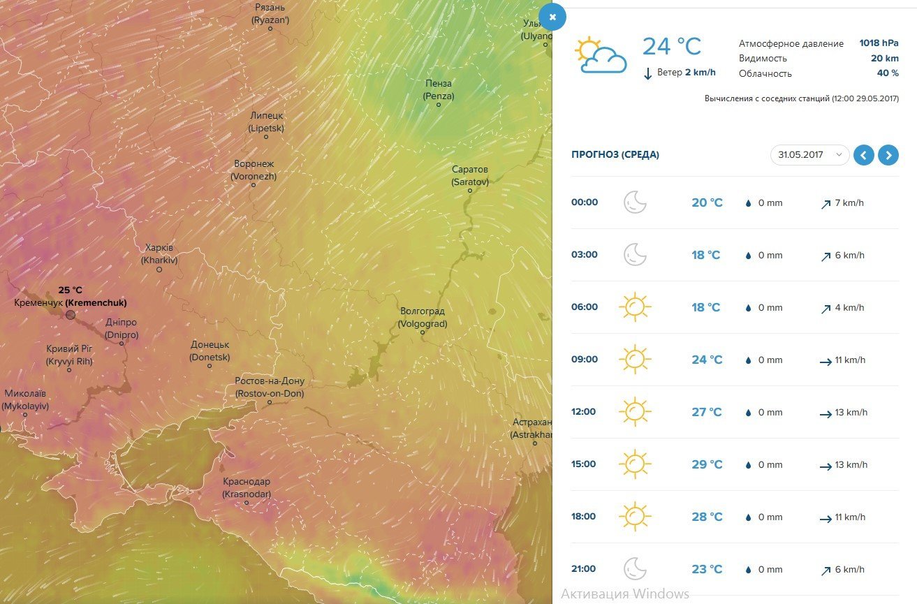Sinoptik опадів кременчужанам взагалі не прогнозує. Погода, за їх прогнозом, буде сухою та сонячною. Лише у вівторок, 30 травня, та п’ятницю, 2 червня, небо вкриють хмари. Температура повітря коливатиметься від +11ºС до +28ºС.