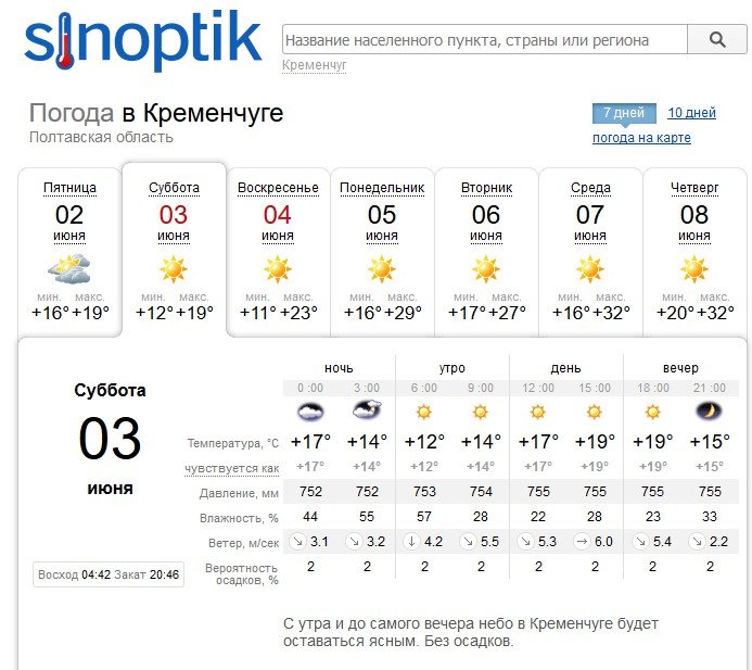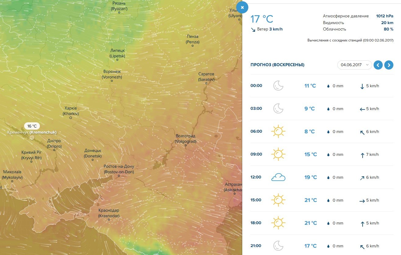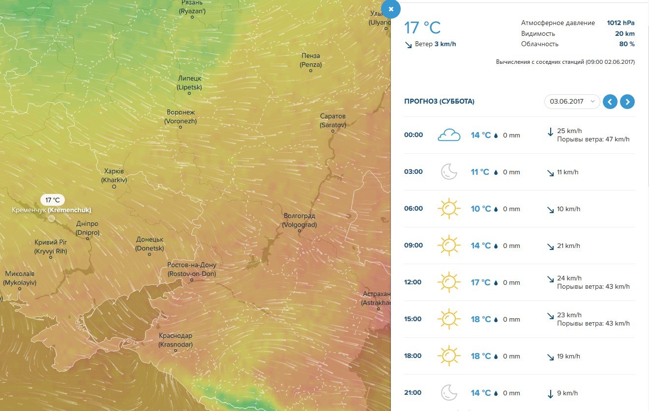 Про сильний поривчатий вітер до 13 м/с у суботу, 3 червня, попереджає кременчужан Ventusky. Погода буде сонячною та сухою, небо ясним, а повітря прогріється до +18ºС.