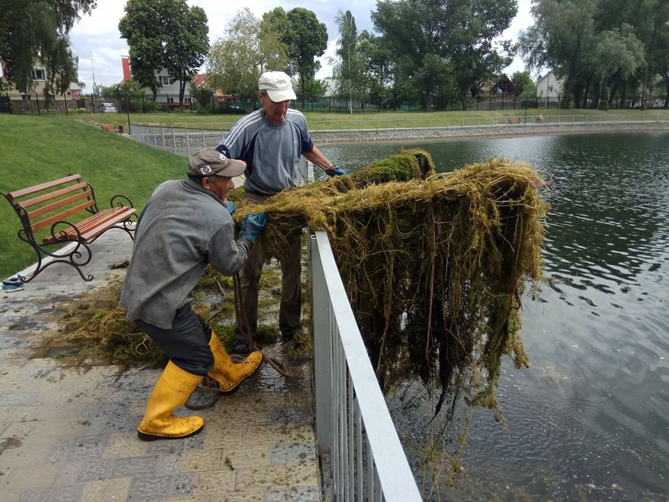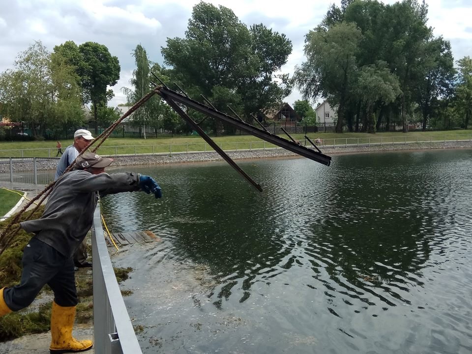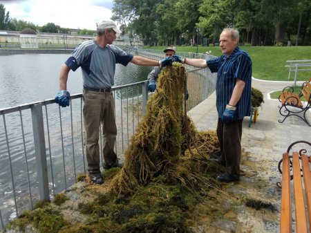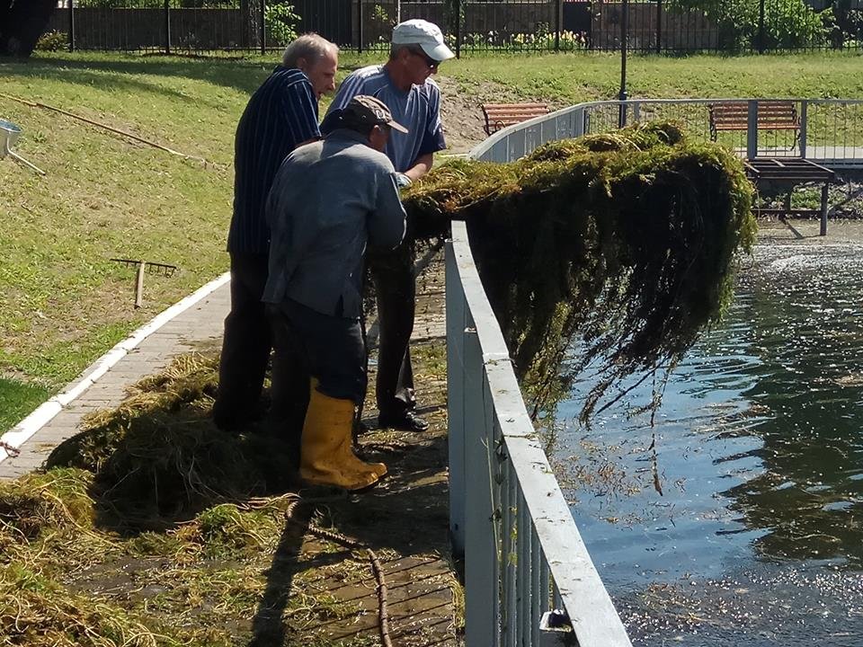 Озеро у Міському саду чистять за допомогою спеціального пристрою схожого на вила.