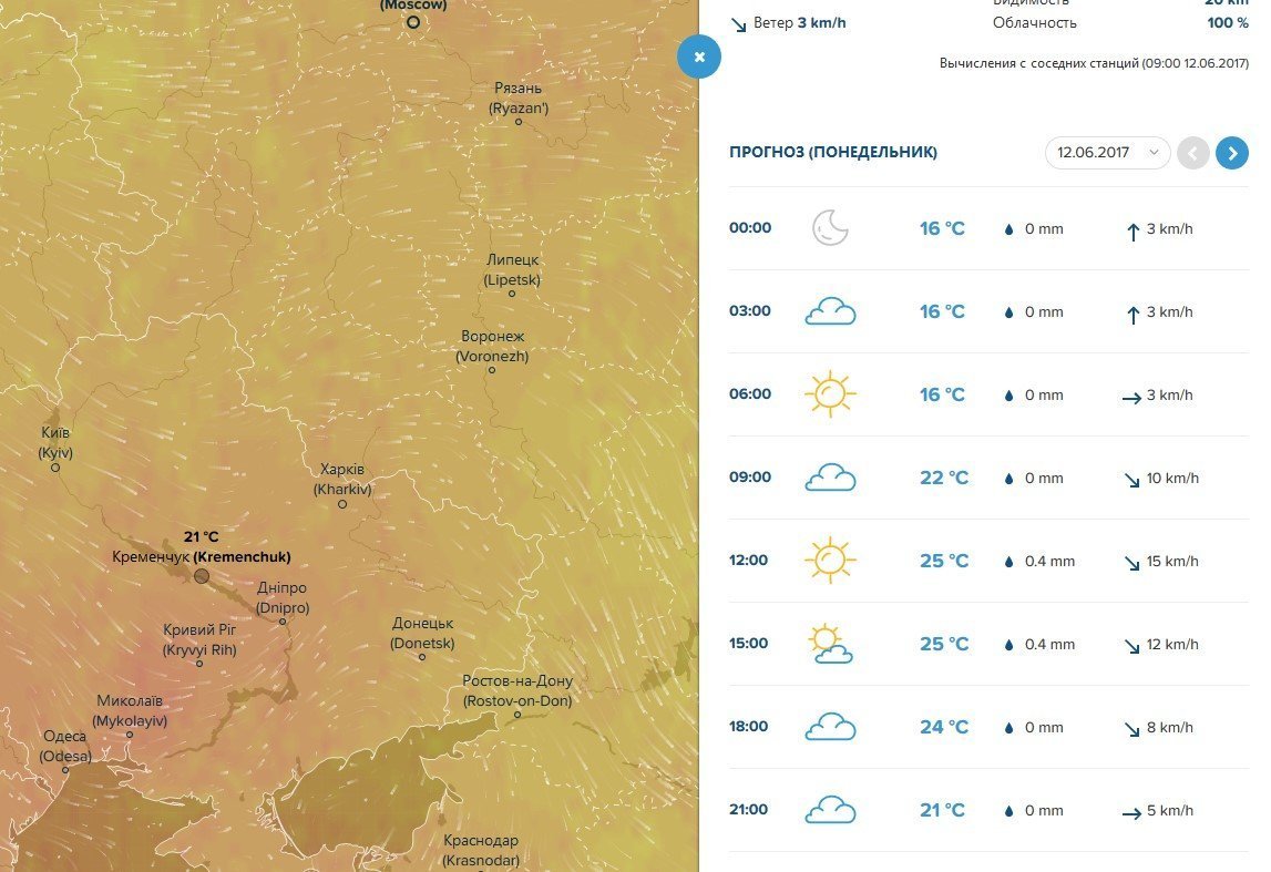 Rp5 попереджає про незначний дощик у середу, 14 червня, та четвер, 15 червня. Зливи можливі сьогодні, 12 червня, завтра, 13 червня, а також в ніч з суботи, 17 червня, на неділю, 18 червня. В цю ж ніч на місто впаде густий туман. Пориви вітру до 14 м/с зриватимуть капелюшки з кременчужанок щодня з вівторка, 13 червня, по п’ятницю, 16 червня.