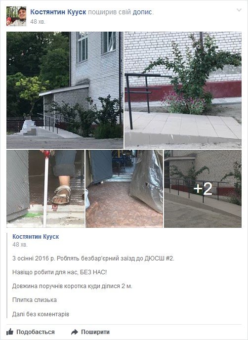 16 червня кременчуцький параспортсмен та керівник ГО «На крилах надії України» Костянтин Кууск виклав на своїй сторінці у Facebook результати інспекції пандусу до ДЮСШ №2.