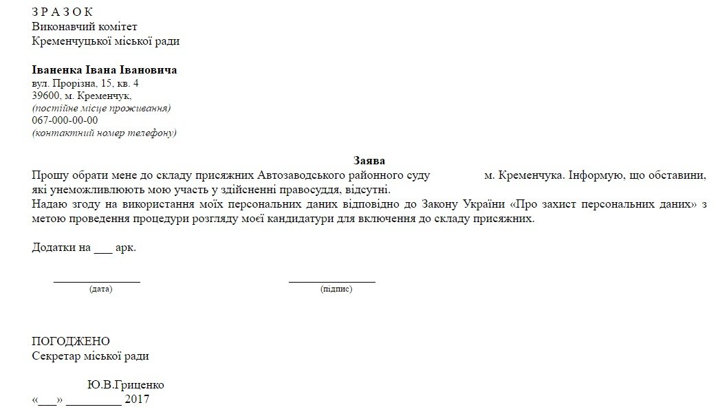 Якщо Ви постійно проживаєте на території, на яку поширюється юрисдикція Автозаводського районного суду міста Кременчука, та виявили бажання бути присяжним, просимо подавати до виконавчого комітету Кременчуцької міської ради (пл. Перемоги,2, каб. 521) наступні документи: