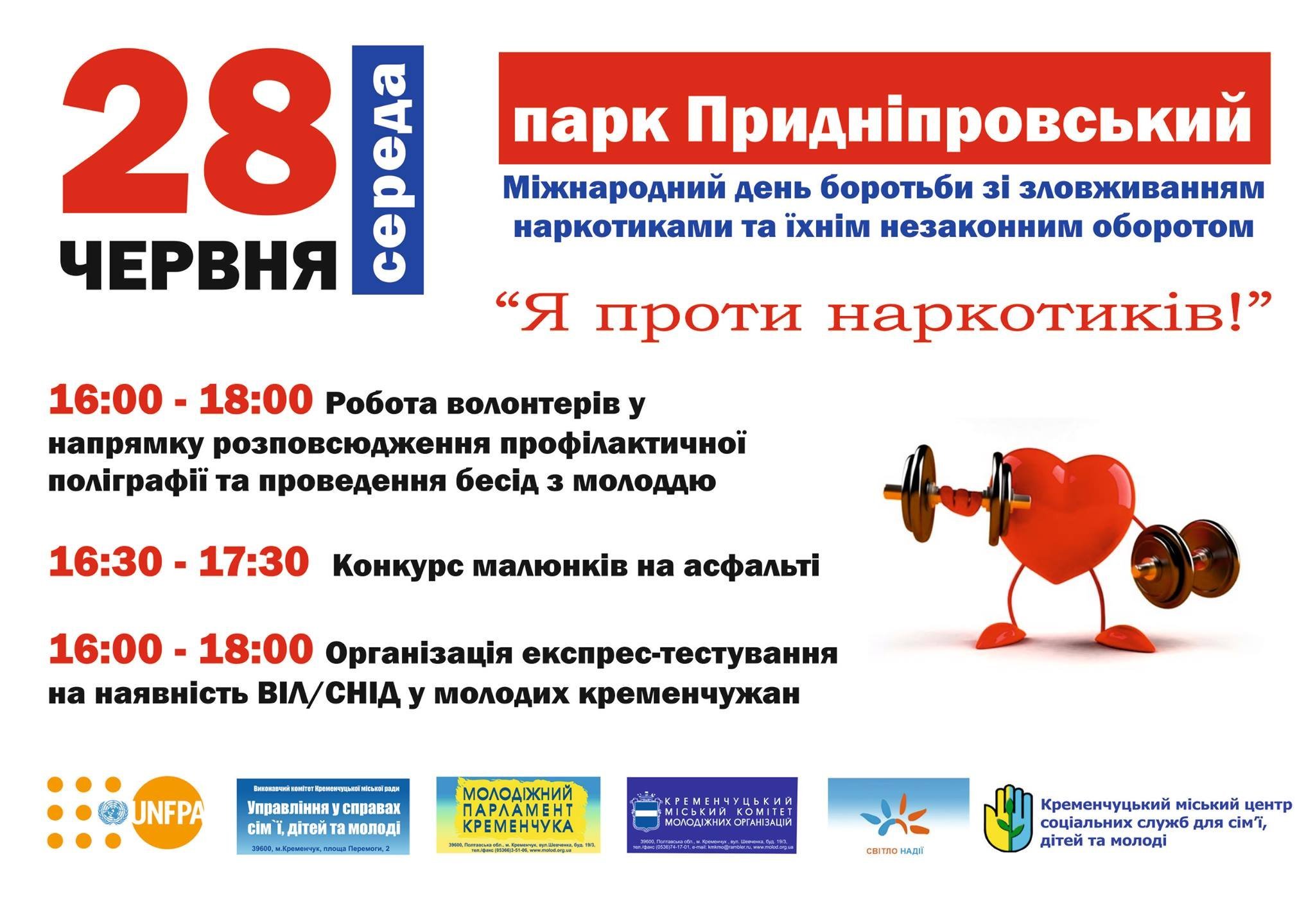 З нагоди Всесвітнього дня боротьби із зловживанням наркотиків та їх незаконним обігом у Кременчуці пройде профілактична вулична акція «Я проти наркотиків». У рамках якої волонтери проведуть опитування кременчужан, щодо згубних звичок, розповсюдять профілактичні буклети та поговорять з молоддю.