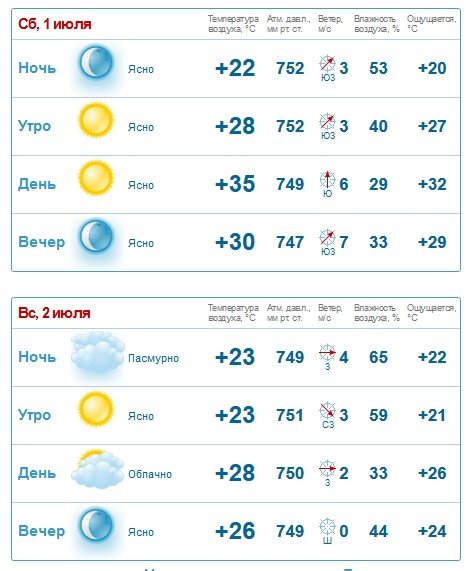 +35ºС жары в субботу, 1 июля, и сухую, ясную погоду прогнозируют нам и на Gismeteo. в воскресеньё, 2 июля, по их прогнозу, погода будет пасмурной, но без осадков. Максимальная температура воздуха - +28ºС.
