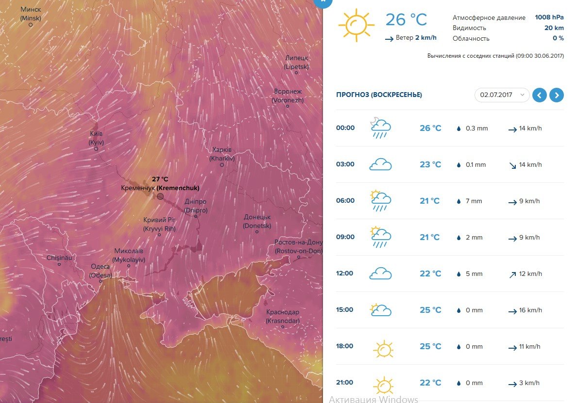 Rp5 предупреждает кременчужан не только о жаре до +33ºС, в субботу, 1 июля, но и о порывах ветра до 13 м/с. Воскресенье, 2 июля, по их прогнозу начнётся дождём и ливнем, а закончится сухой и тёплой погодой.