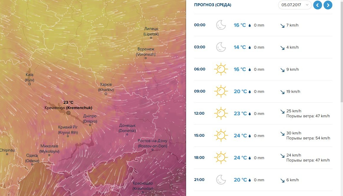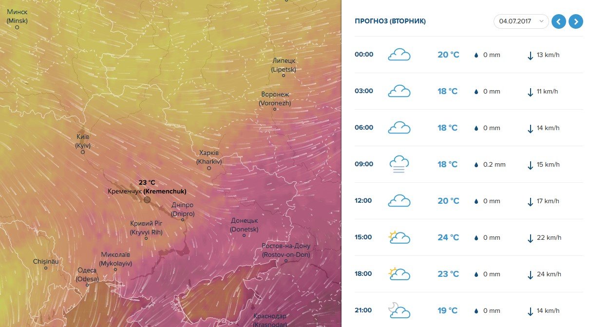 Зливу у віторок, 4 липня, та невеликий дощик у четвер, 6 липня, та п'ятницю, 7 липня, обіцяє кременчужанам rp5. Також тут попереджають про вітрюган з поривами до 15 м/с з вівторка, 4 липня, по п'ятницю, 7 липня. Максимально повітря прогріється до +23ºС.