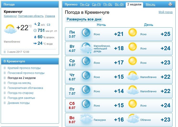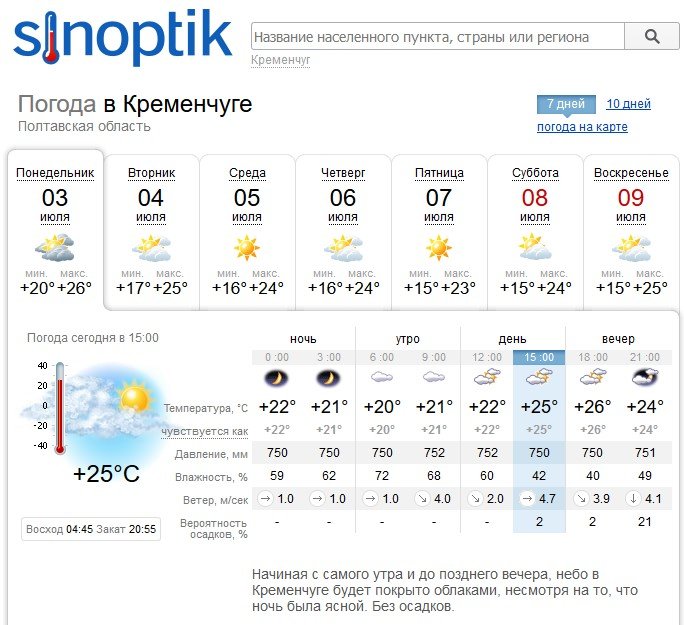 Gismeteo навпаки, обіцяє нам переважно ясну погоду - трохи захмариться лише у четвер-п'ятницю, 6-7 липня, та у неділю, 9 липня. Невеликий дощ можливий в ніч на вівторок, 4 липня.