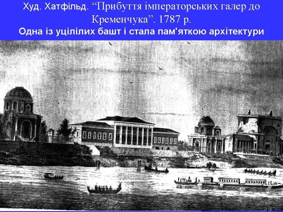 До приїзду Катерини ІІ князь Григорій Потьомкін у Кременчуці розгортає на березі Дніпра будівництво приміщень «присутственных мест», у період між 1783 і 1787 роками. Вони являли собою ансамбль, який вражав погляд. Центральна частина ансамблю – одноповерхові будівлі з восьмиколонним портиком - по боках була прикрашена двома мурованими вежами, перекритими куполами. Зображення цього ансамблю збереглося на малюнку англійського художника Хатфільда, який належав до почту Катерини ІІ і протягом всієї мандрівки на південь країни робив невеликі замальовки міст, де зупинялася імператриця (зберігаються в музеї «Ермітаж»).
