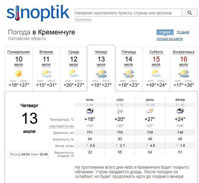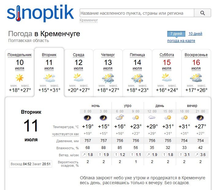 На Sinoptik обіцяють, що ясним небо над Кременчуком буде лише сьогодні, 10 липня, а усі інші дні сонце ховатиметься за хмарами.