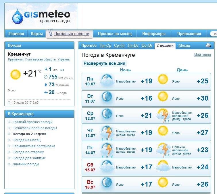 Більше сонячних днів - у понеділок, 10 липня, вівторок, 11 липня, четвер, 13 липня, та неділю, 16 липня, прогнозує Кременчуку Gismeteo. Але тут нам і дощовитих деньків біцяють більше - у середу, 12 липня, четвер, 13 липня, та п'ятницю. 14 липня, слід чекати на грозу. Температура повітря, за їх прогнозом, не підніметься вище +30ºС.