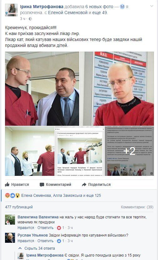 Известный кременчугский волонтер Ирина Митрофанова заявила на своей странице в Фейсбук о том, что врач из так называемой «ЛНР» Климов причастен к пыткам военных на оккупированной территории.