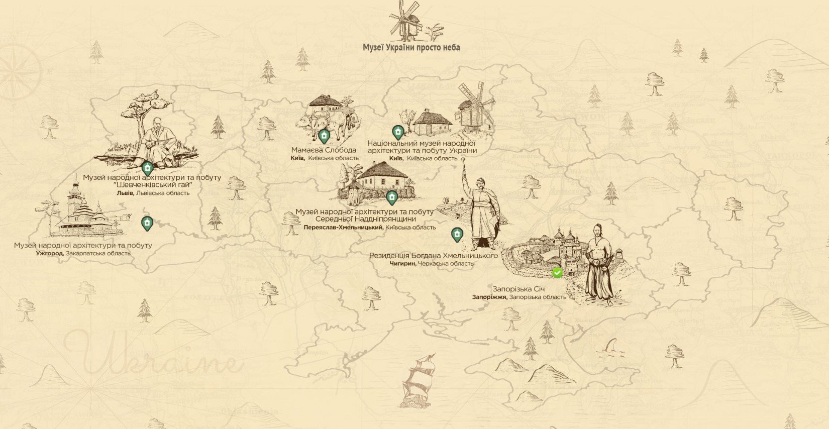 Зараз, не виходячи з дому, можна побувати у музеях народної архітектури та побуту у Києві (Пирогів), Львові ("Шевченківський гай"), Переяслав-Хмельницькому та Ужгороді, а також з Центрі народознавства "Мамаєва Слобода" (Київ), Запорізькій Січі - заповіднику "Хортиця" (Запоріжжя) та резиденції Богдана Хмельницького у Чигирині.