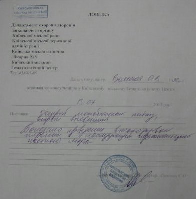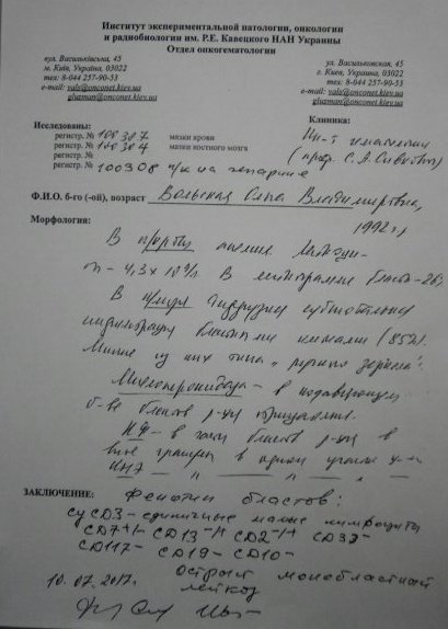– Оля почала блідніти на очах. У Києві лікувалися близько тижня, там ми стукали у всі двері, навіть доводилося чекати по 3-4 години лікарів під кабінетами. Цей довгий коридор, в якому ми чекали, ми назвали дорогою в нікуди. Хвороба почала прогресувати і ми не могли більше чекати, тому вирішили поїхати в Білорусь. Зараз там Оля з дівчиною з Білої Церкви разом в окремому боксі лікуються. Лікарі радять по менше ходити, рухатися, адже зайве навантаження загрожує крововиливом, – розповіла тітка Оксана. – Зараз на лікування необхідно близько 40 тисяч доларів на хіміотерапію, потім чекає трансплантація, яка коштує близько 120 тисяч доларів. На жаль, у нас таких грошей немає.