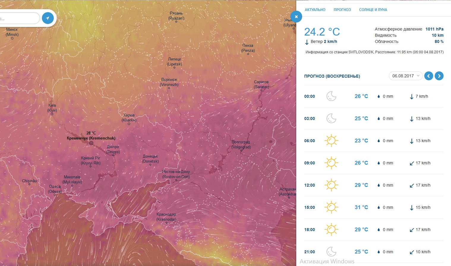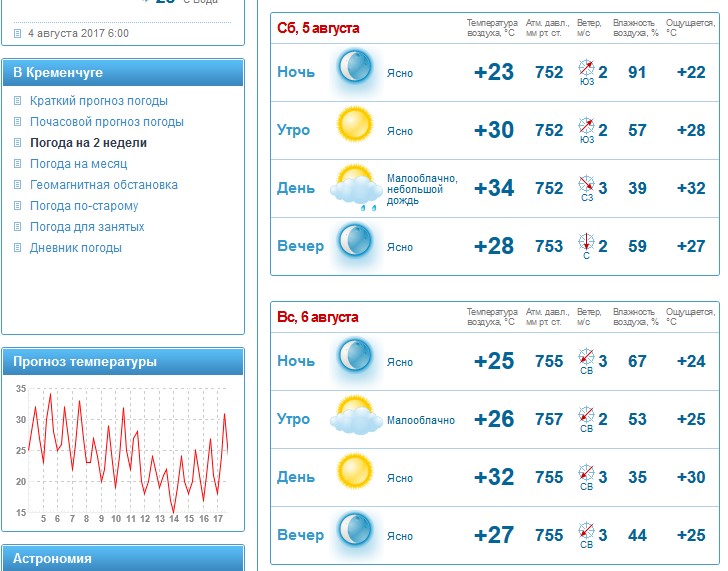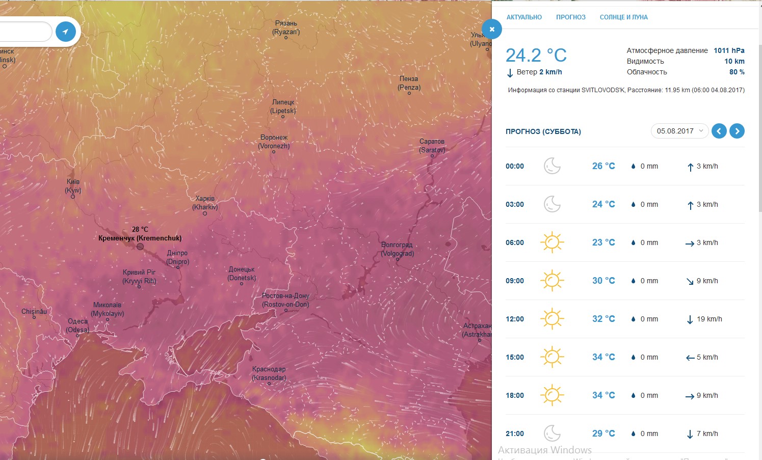 Ventusky обіцяє нам абсолютно суху та ясну погоду. У суботу, 5 серпня, за їх прогнозом, повітря прогріється до +34ºС.
