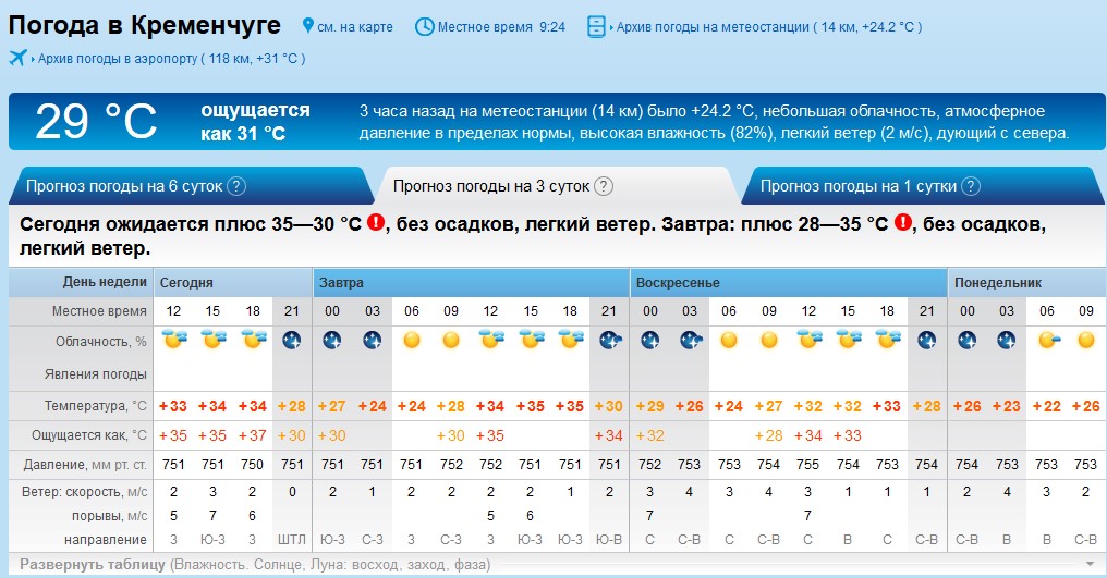 За прогнозом rp5, у суботу, 5 серпня, температура повітря сягне +35ºС, а у неділю - +33ºС. Можливі пориви вітру до 7 м/с.