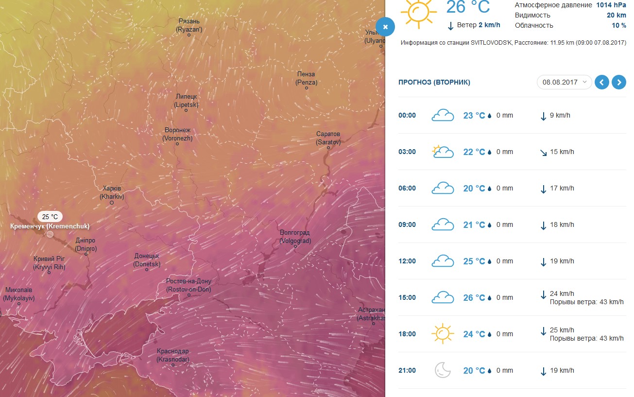 Ventusky предупреждает, что во вторник, 8 августа, почти весь день небо будет скрыто за облаками и подымется сильный северный ветер с порывами до 12 м/с. Максимально воздух прогреется до +26ºС.