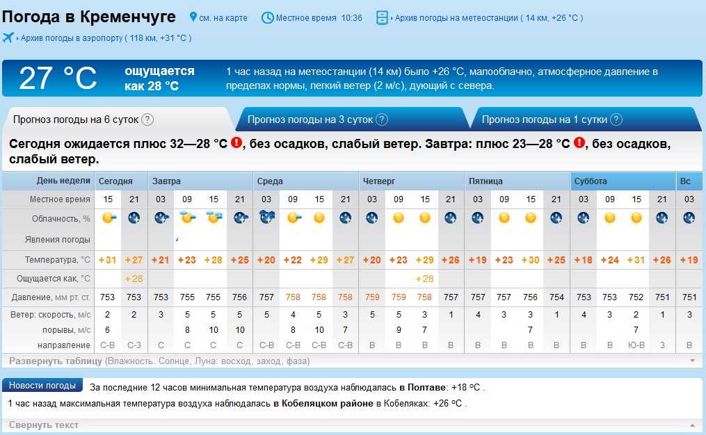 Sinoptik прогнозирует ясную и солнечную погоду в Кременчуге на протяжении всей недели, кроме среды, 9 августа. Температура воздуха будет держаться на уровне +30-33ºС.