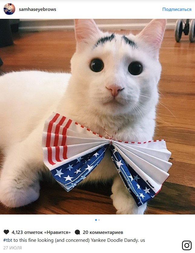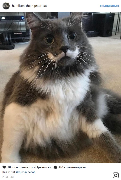 Самый стильный на сегодняшний день кот-хипстер — Гамильтон. Его усам завидуют многие. Хозяин рассказывает — не смог устоять перед обаянием Гамильтона, когда выбирал себе домашнего питомца. А сейчас с удовольствием собирает все мемы со своим любимцем и радуется его известности.
