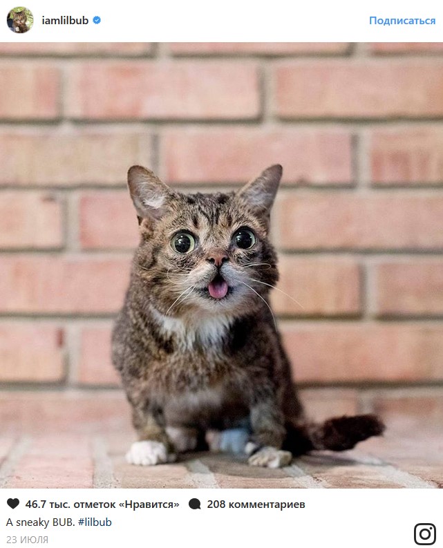 Наверное самым известным котом в соцсетях стал Grumpy Cat, он же - сердитый кот. Этот вечно недовольный кот стал знаменитостью благодаря необычной внешности. которая не выражает его отношения к происходящему, а является результатом врожденной карликовости и неправильного прикуса. Настоящее имя кота — Tardar Sauce.