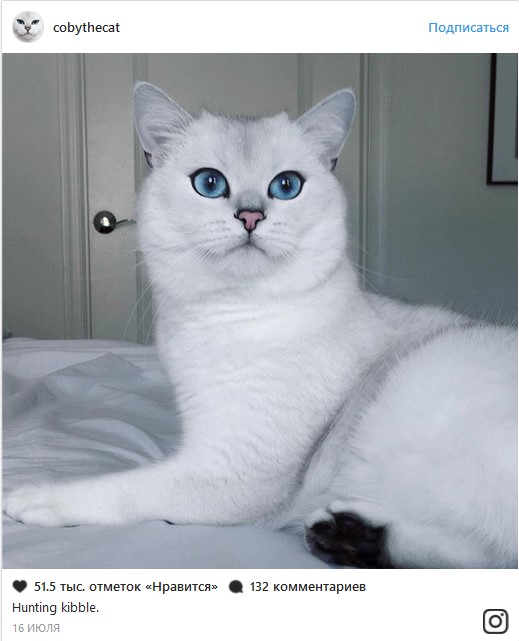 Коту с самыми красивыми глазами — Коби всего 2 года, но он уже стал звездой. Над тем, реальность это и фотошоп долго велись споры, ведь его огромные синие глаза с черной подводкой действительно выглядят невероятно. Порода кота — британская короткошерстная. По словам хозяйки Коби, он любит спать на подушке, играть с резиновой уточкой в ванной и консервы из тунца.