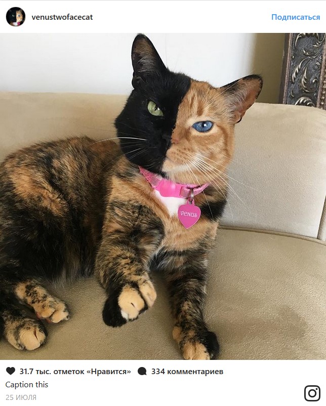 Кошка Венера известна двуликим окрасом — одна половина ее мордочки черная, а другая рыжая. Кроме этого, глаза у неё тоже разного цвета. Причиной этому стала гетерохромия — патология, которая характеризуется избытком или же наоборот нехваткой меланина в организме. Анализ ДНК, взятый с разных сторон мордочки Венеры, будет разным. Кошка живет в США, ее забрали из приюта.
