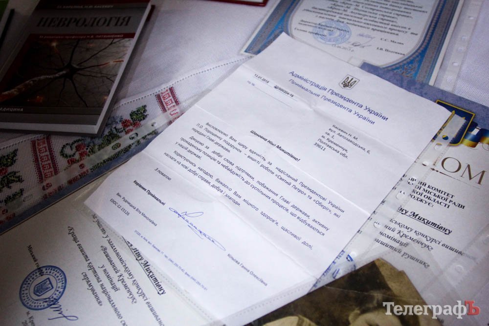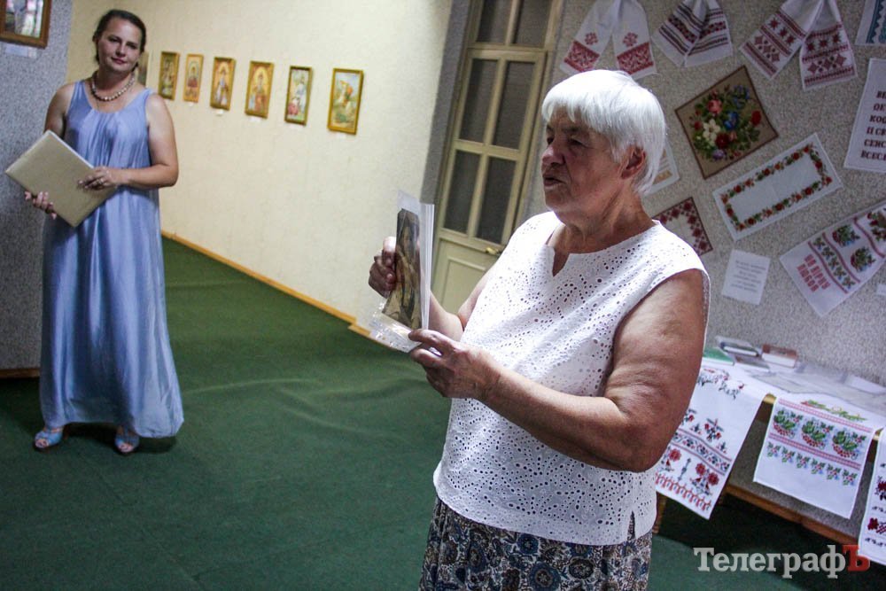 Привітати з дебютною виставкою Ніну Микитівну прийшли не лише пересічні кременчужани, але й онуки і правнуки майстрині. Онучка Аня підготувала бабусі подарунок – український танок в національному вбранні. Під ритм музики Ніна Микитівна тихенько вираховувала кожен рух онучки.