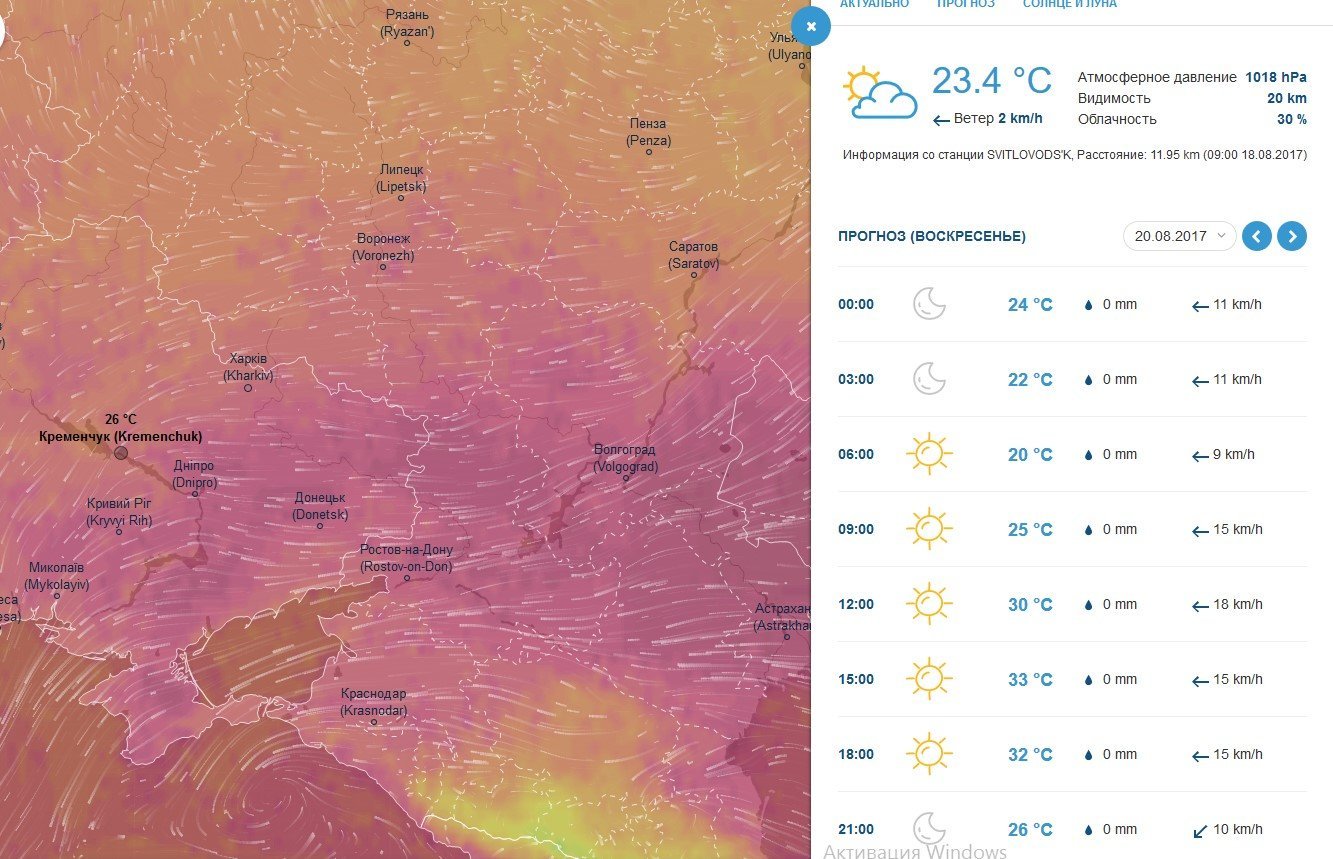 Относительно направления ветра прогнозы более или менее сходятся. В субботу-воскресенье ветер будет преимущественно восточный и юго-восточный, а значит дым и вонь не помешают кременчужанам отдохнуть. Но будьте готовы к тому, что вечером в воскресенье, 20 августа, направление ветра изменится на северо-восточный, а значит в город потянет ароматы предприятий северного промузла.