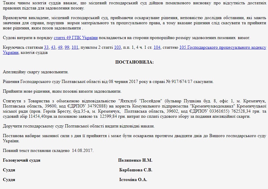 В результате рассмотрения дела, суд принял решение, по которому ООО «Яхтклуб «Посейдон» должен КП «Кременчугводоканал» 762 528 грн, а также 11 454 грн судебного сбора по исковым заявлением и 12 599 грн расходов по уплате судебного сбора за подачу апелляционной жалобы.