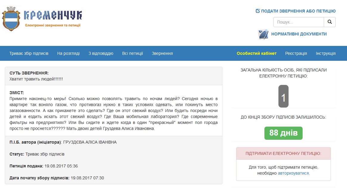 19 августа на сервисе электронных петиций мэрии появилось новое обращение к мэру Кременчуга Виталию Малецкому с просьбой «принять наконец-то меры и не позволять травить по ночам людей».