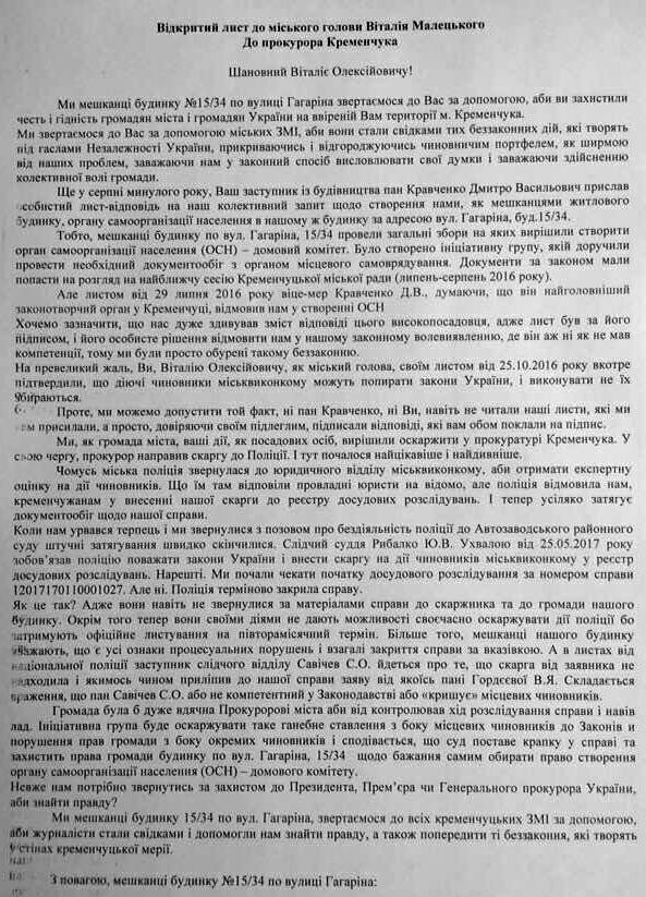 Кременчужане, живущие в доме №15/34 на ул. Гагарина, через суд будут требовать, чтобы мэрия зарегистрировала их орган самоорганизации населения. Граждане написали открытое письмо мэру Виталию Малецкому и руководителю Кременчугской местной прокуратуры.
