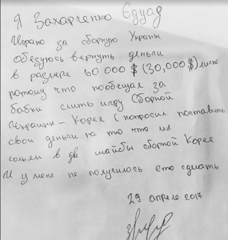 Воротаря Едуарда Захарченка та захисника Володимира Вариводу хокейного клубу «Кременчук» підозрюють у «зливі» матчів збірної України. У розписці хокеїсти обіцяють повернути 30 тис. доларів у разі, якщо збірна України не програє корейцям на чемпіонаті світу з різницею щонайменше у дві шайби.