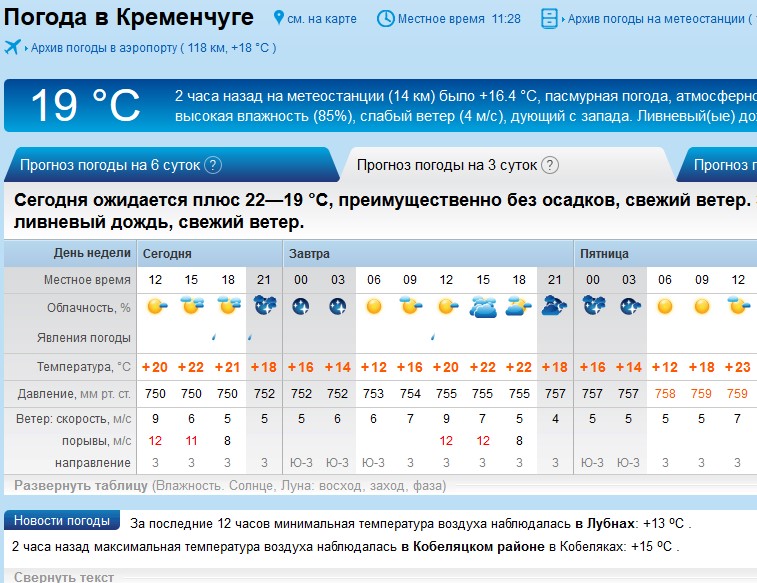 Rp5 прогнозирует ливень в первой половине дня, а затем сильный ветер с порывами до 12 м/с.