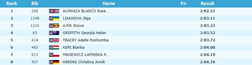 Ольга Ляхова посіла друге місце у фіналі 800-метрівки, подолавши дистанцію за 2 хвилини 03,11 секунди. На цій дистанції перемогла кубинка Алманса Бланко (2.02,21), "бронза" дісталася Докус Аджок з Уганди (2.03,22).