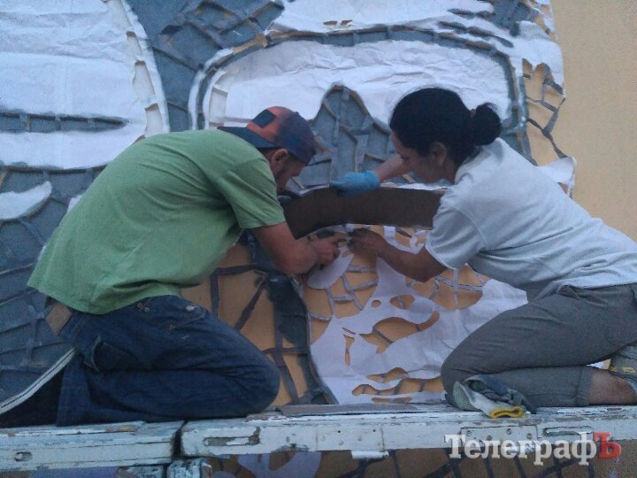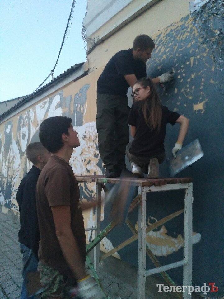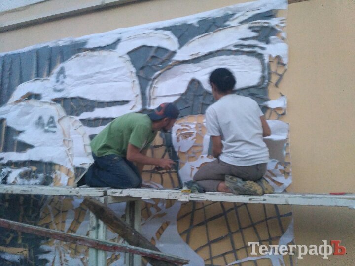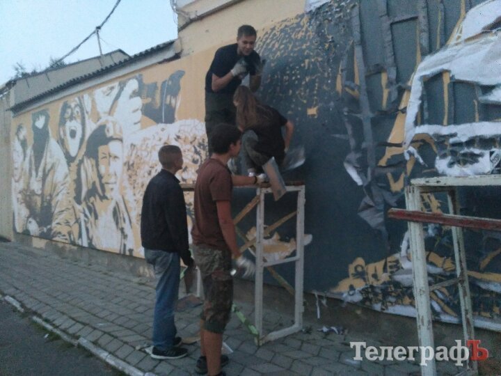9 вересня кременчужани продовжили роботу над створенням графіті «Погляд». Майже половину малюнка вже наніс художник Сергій Брильов разом зі своїми помічниками.