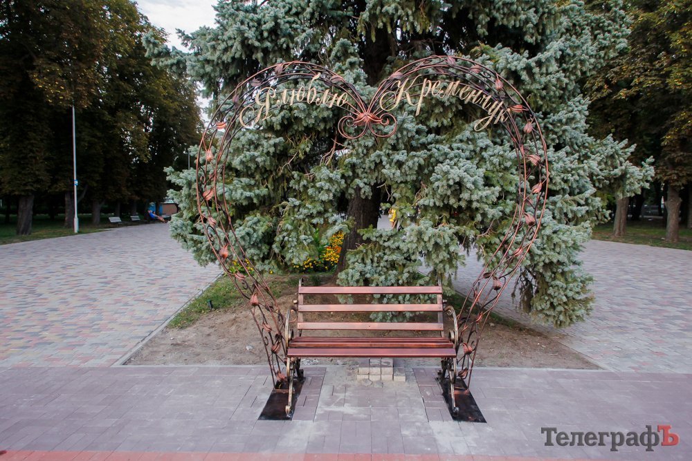 Над небольшой лавочкой возвышается конструкция в виде сердца с надписью «Я люблю Кременчуг».