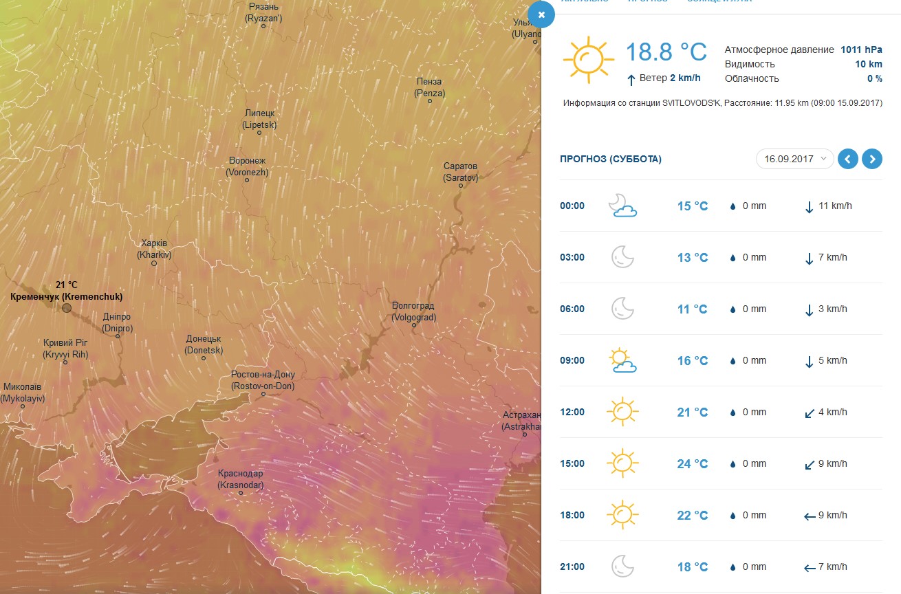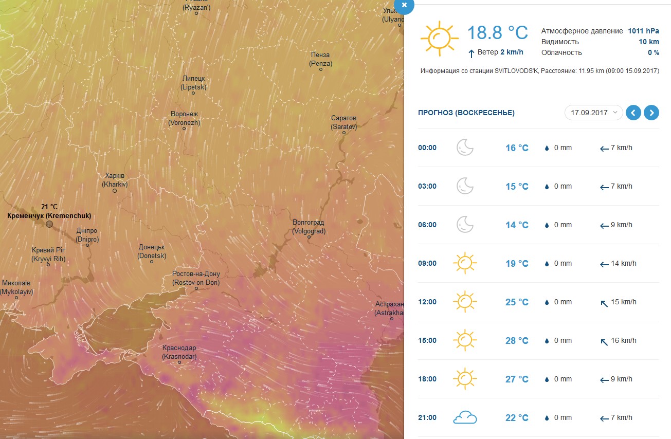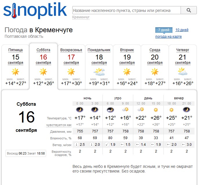 Ще гарячіші вихідні обіцяють кременчужанам Sinoptik та Gismeteo: тут, за прогнозом, у суботу, 16 вересня, стовпчики термометрів досягнуть позначки у +26ºС, а у неділю, 17 вересня, до +30ºС.