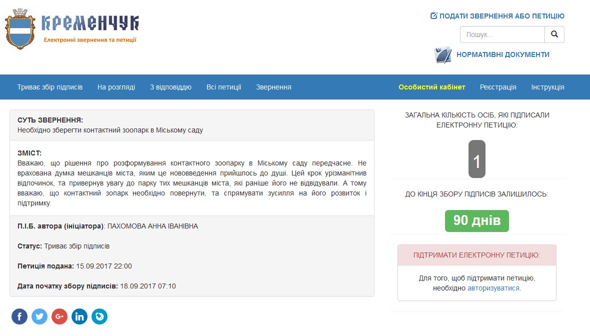 Вторую петицию создал Андрей Гусач. Он просит мэра продолжить создание контактного зоопарка в Городском саду. Автор считает, что «классический парк» нужно создавать в Приднепровском парке.