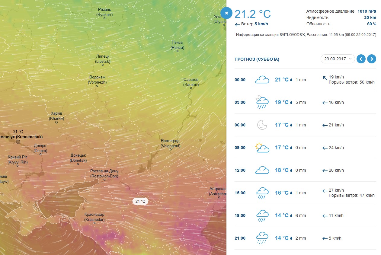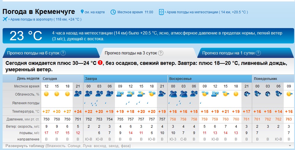 На Rp5 прогноз теплее - до +20ºС...+21ºС. Также тут кременчужан предупреждают о сильном ветре с порывами до 14 м/с.